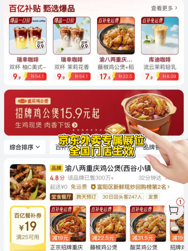 渝八两鸡公煲9月再登京东外卖黄金展位!日期本月22-28号,全国所有门店共享品牌流量加持,广告位价值百万!
